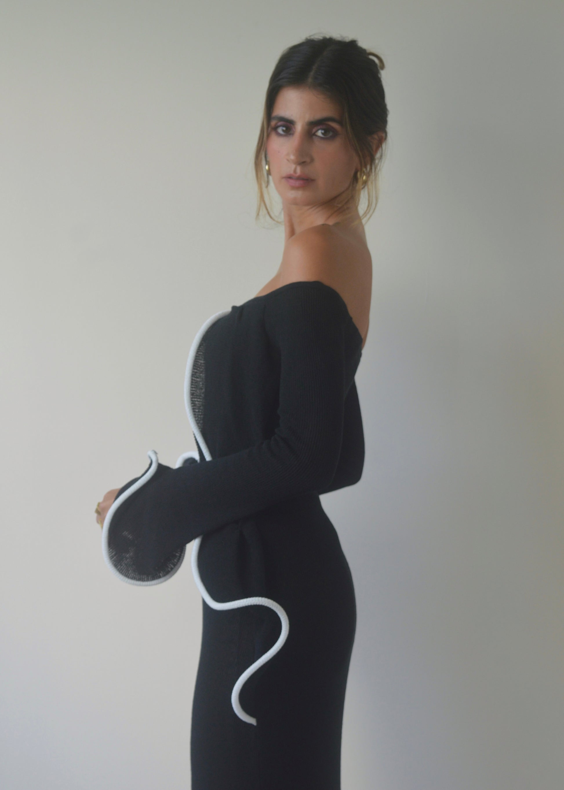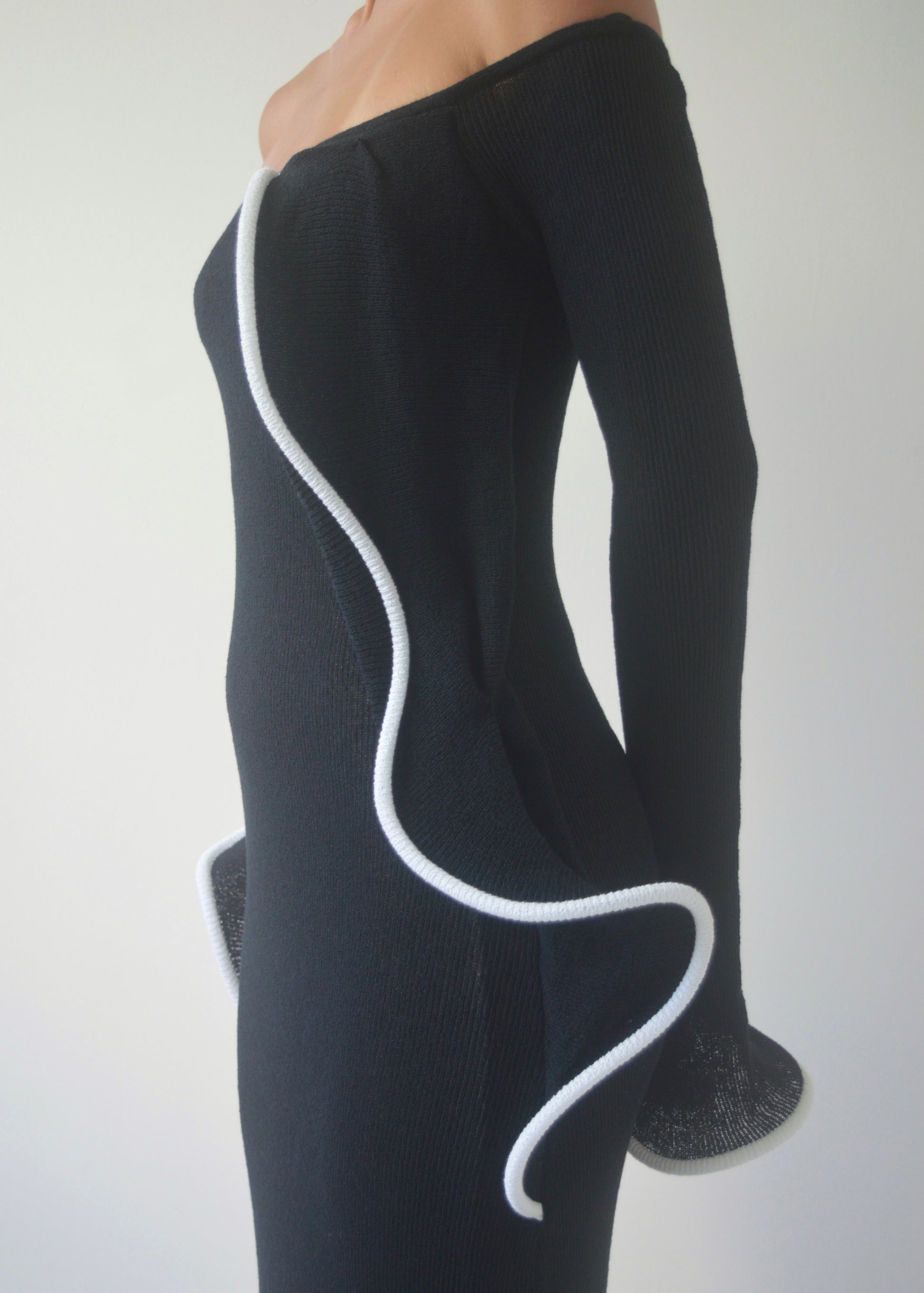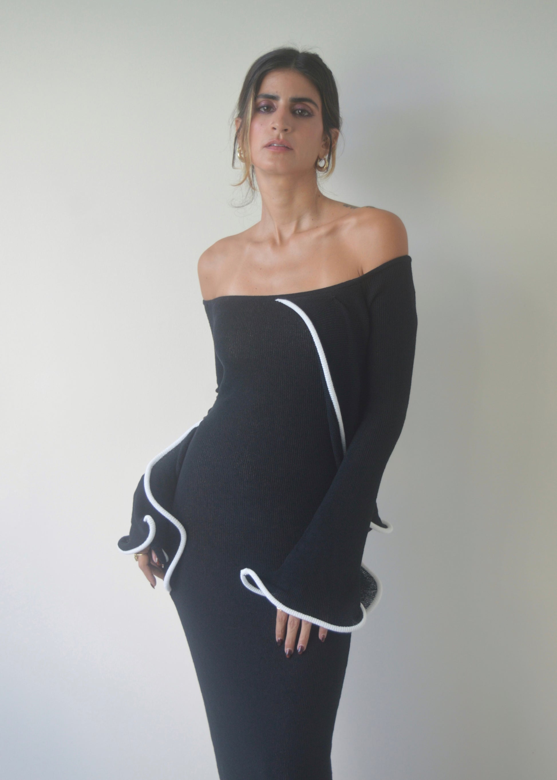 The Midnight Ruffle Maxi Dress features an off-the-shoulder neckline with ruffle trim detailing and long sleeves for an elegant, sculpted silhouette. The fitted design flatters the body, finished with contrast piping and a nude lining through the torso for coverage, while the knit sleeves remain subtly sheer.