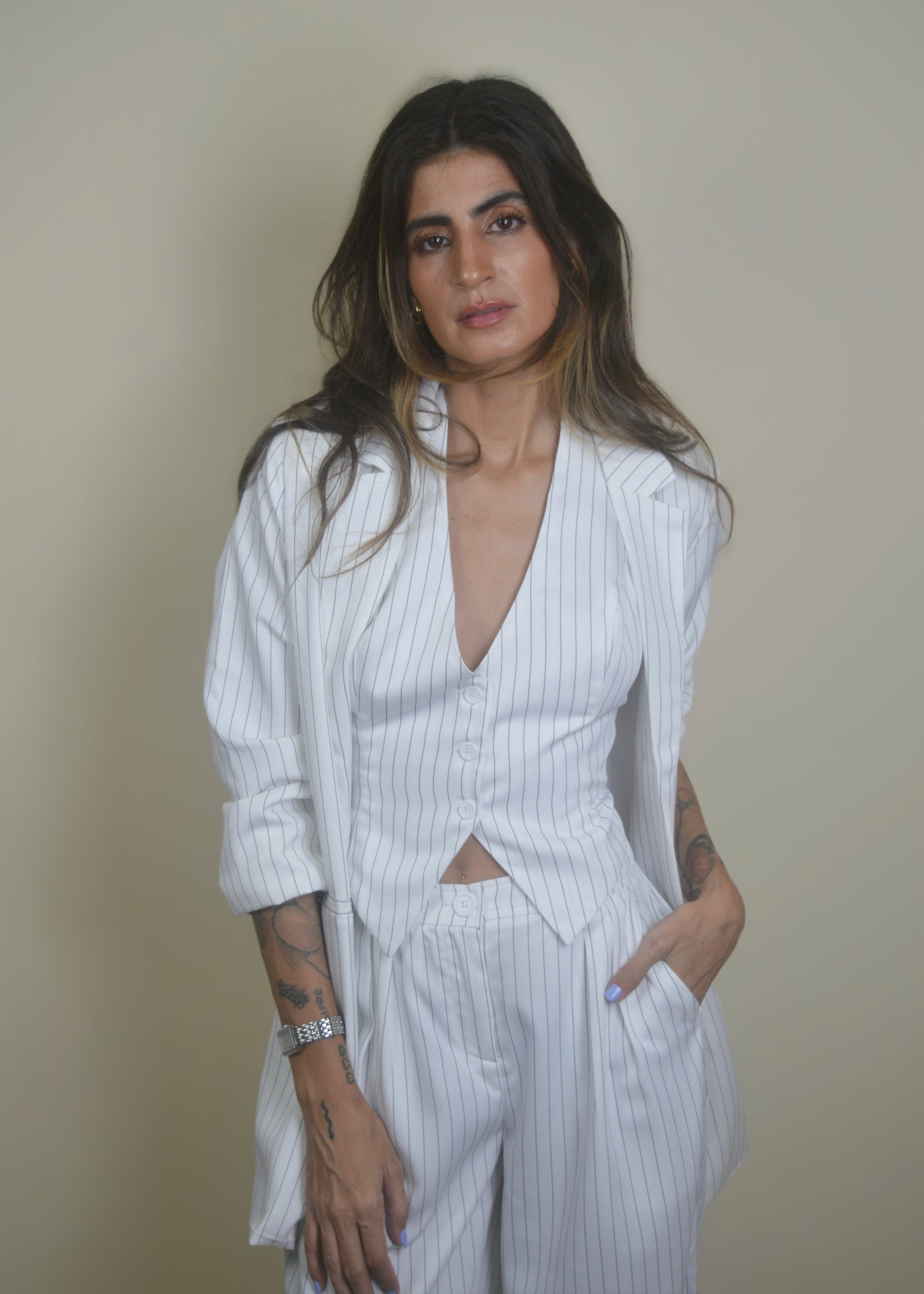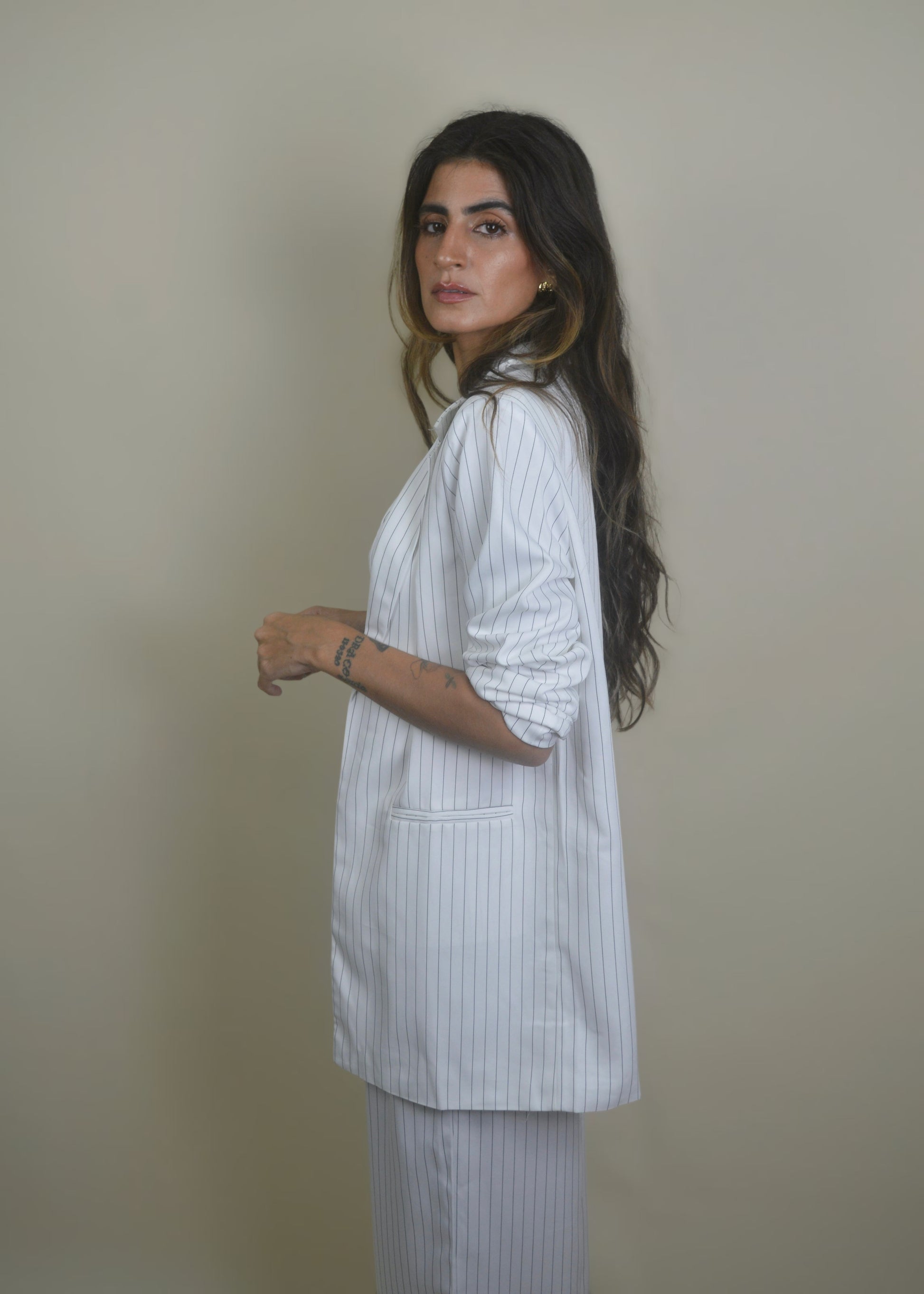 Striped White Light Blazer — an effortless pinstripe blazer with an intentionally oversized fit for that cool, relaxed polish. It’s extra light with a super lightweight inner lining (forro).