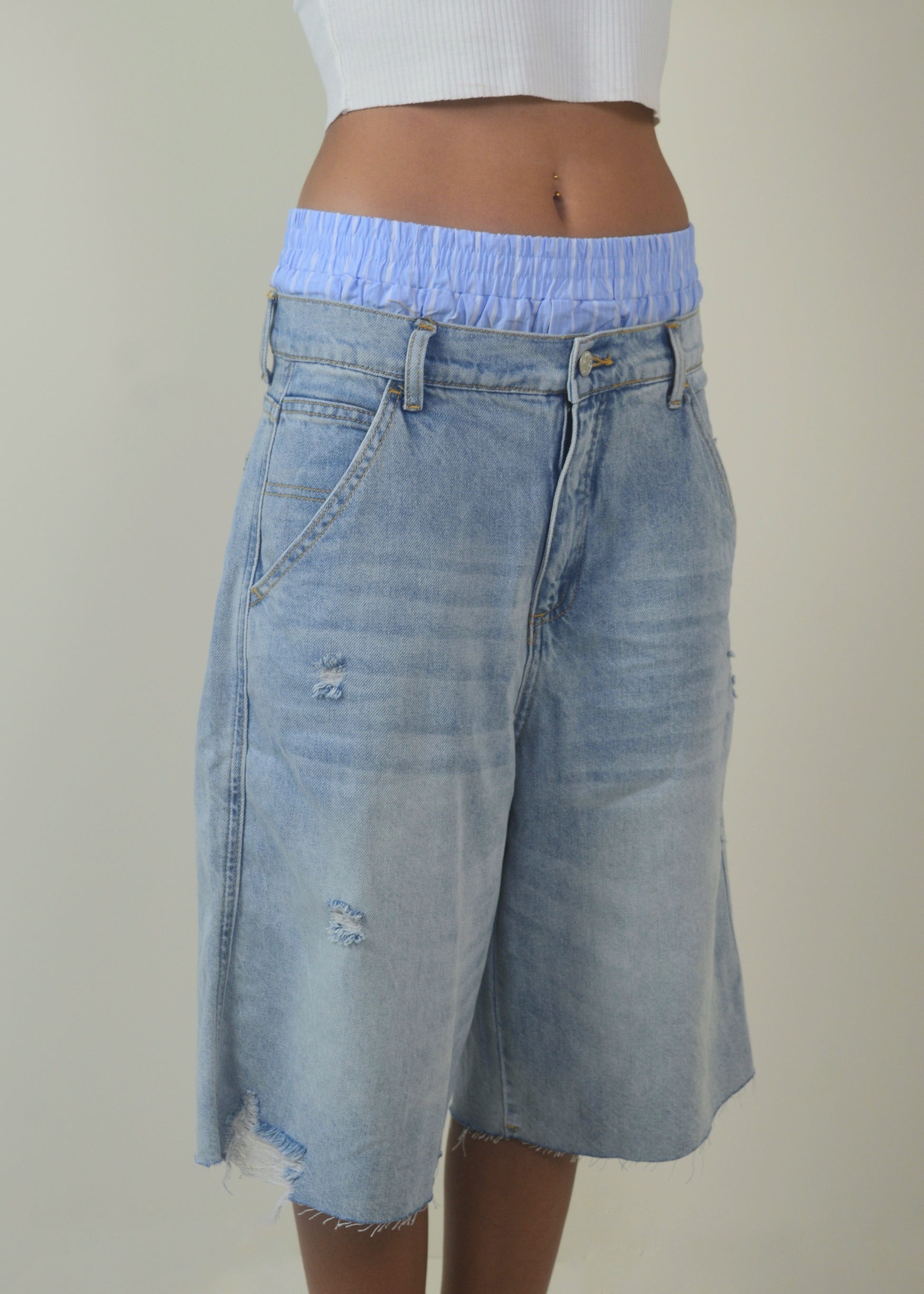 - Design: Medium wash denim with raw hem finish + integrated boxer waist detail (non-removable)