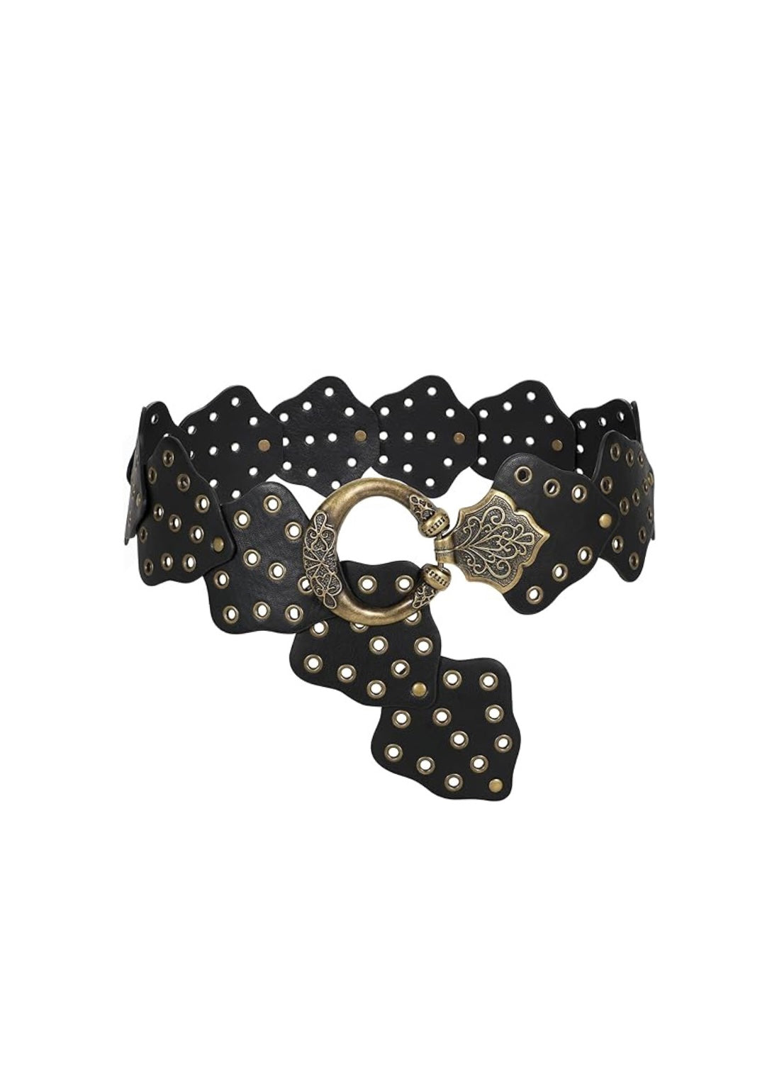 This sculptural leaf-cut belt features antique gold hardware, eyelet details, and a silhouette that makes a statement without trying too hard. Designed to sit at the waist or hips with an adjustable fit, it’s perfect for styling over denim, flowy dresses, or oversized layers.