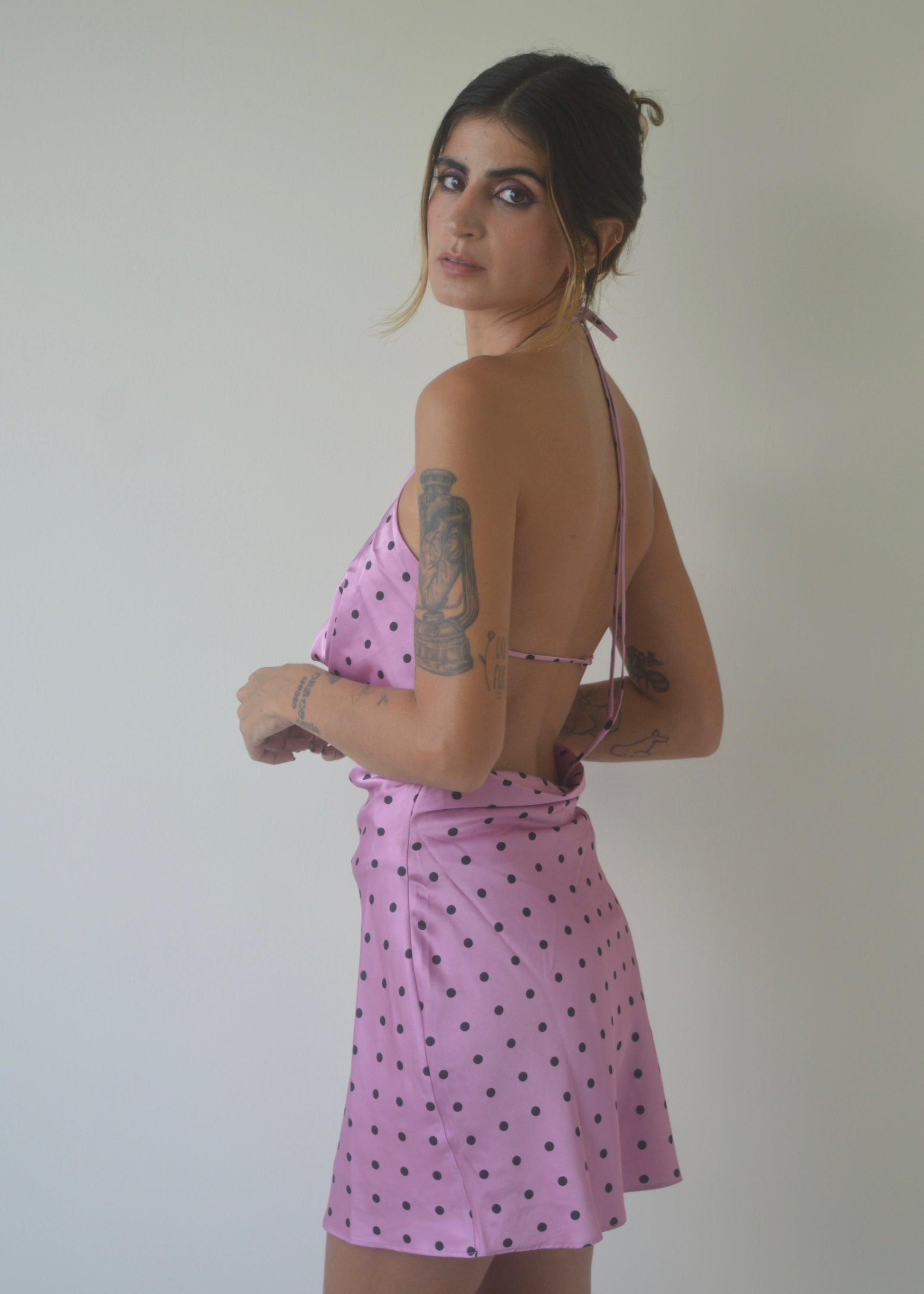 This mauve polka-dot satin dress features a halter-style adjustable tie at the neck, creating a soft draped neckline at the bust. The open back falls into a subtle cowl shape and includes an adjustable back strap for a flattering, customizable fit. Crafted from lightweight satin with lining, it skims the body smoothly with an elegant, effortless feel.