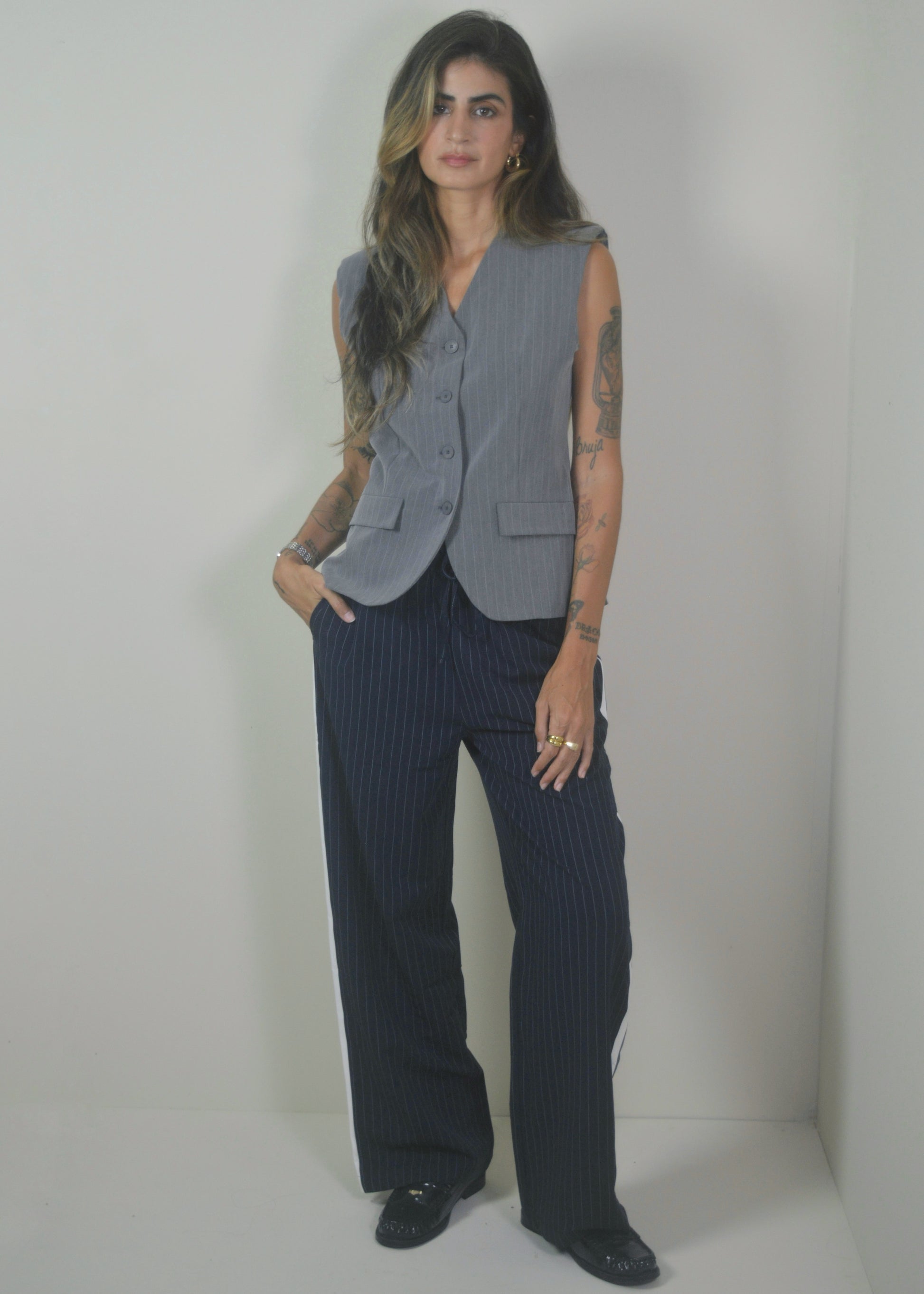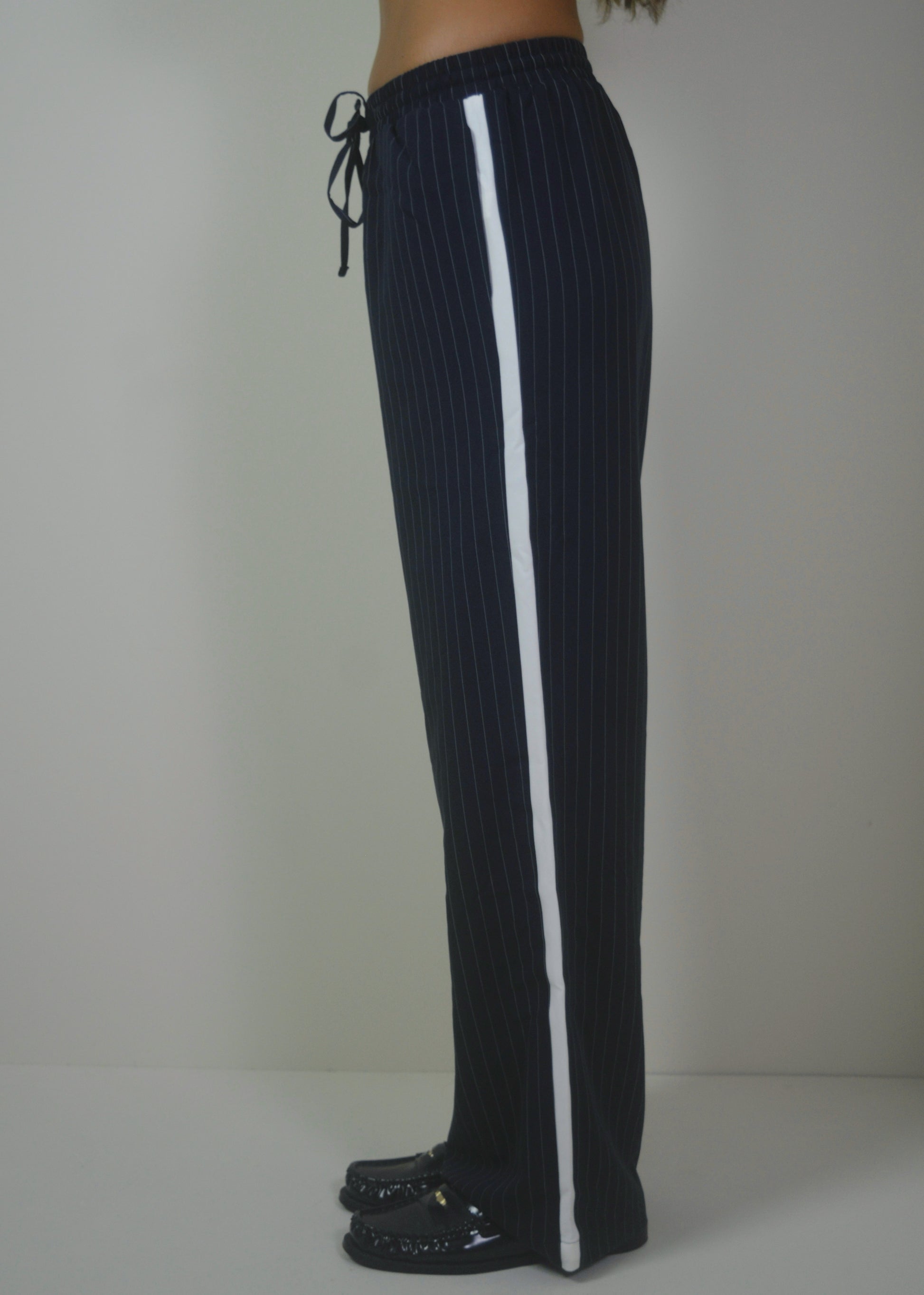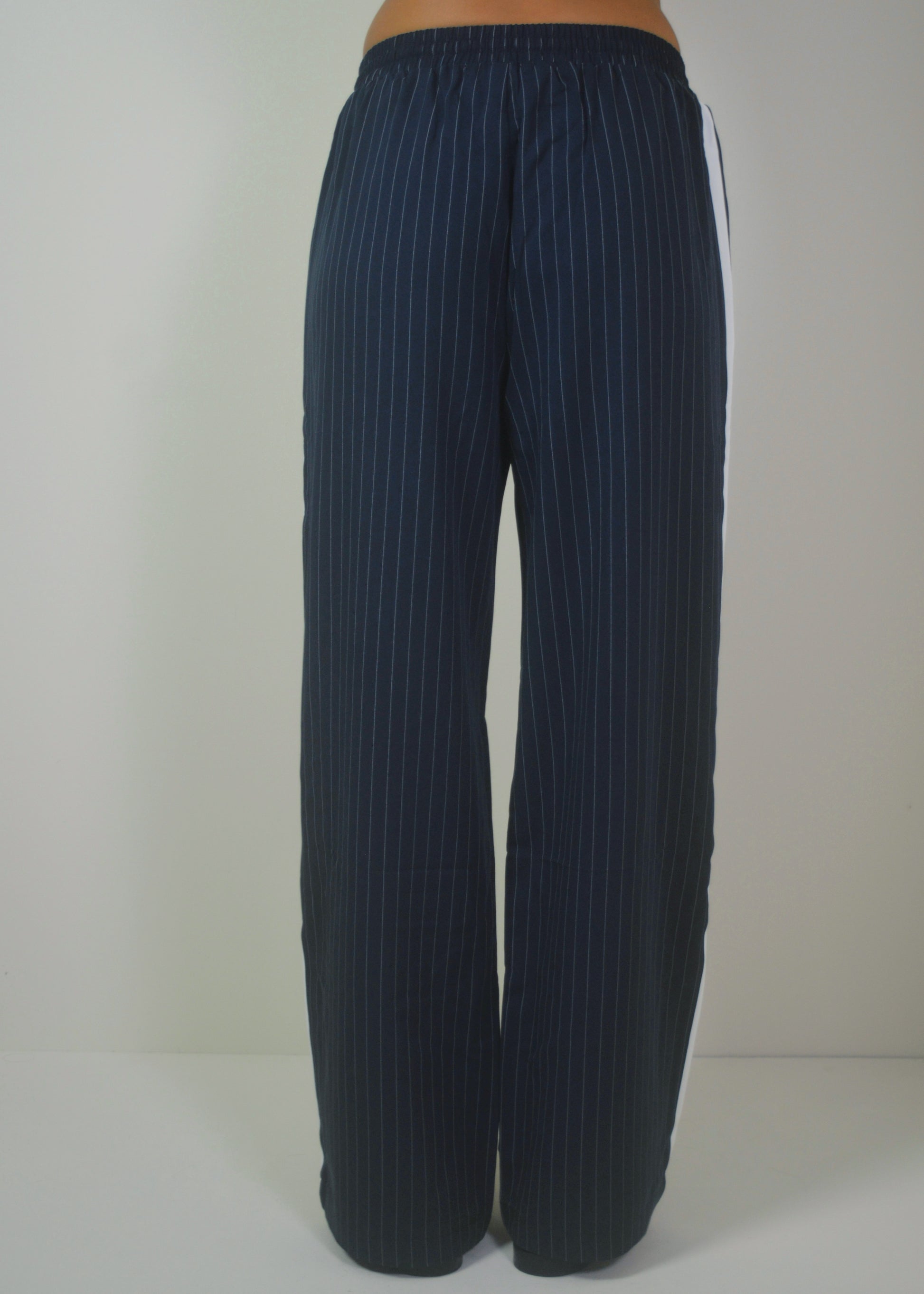 Smart, minimal, and made to move. The Navy Striped Pants bring a tailored feel to everyday wear with their relaxed wide-leg fit, pinstripe pattern, and bold side stripe detail. Designed with a soft drape and elastic waistband for comfort, they strike the perfect balance between polished and laid-back—ideal for work, travel, or off-duty styling.