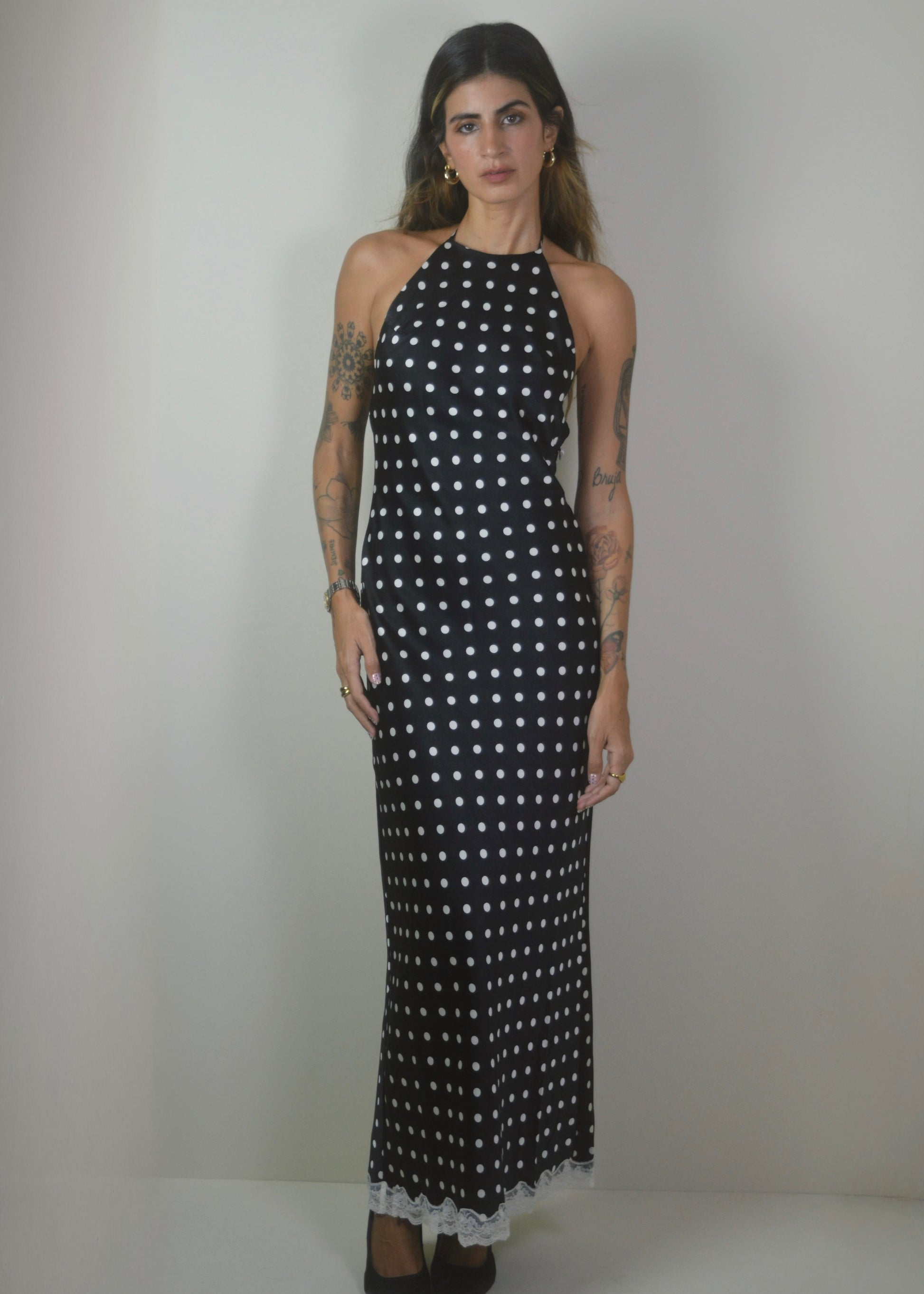 This polka-dot halter dress features an adjustable neckline, open back, and lace-trim hem for the perfect balance of chic and playful. The lightweight woven fabric creates a flattering slip silhouette with a hidden side zipper for a smooth, comfortable fit.